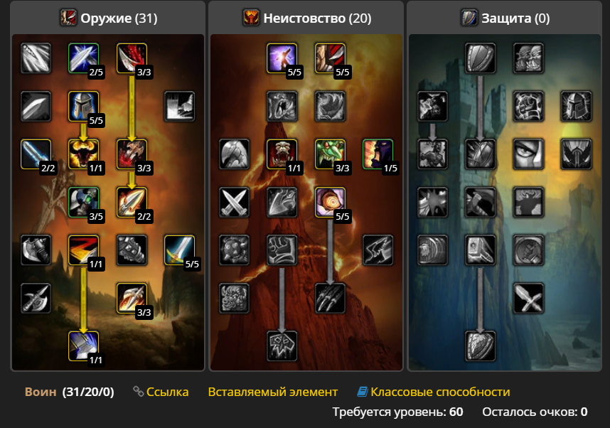 Это стандартный PvP-билд с упором на ветку Оружие и Неистовство. Вам необходимо добраться до талантов Смертельный удар и Исступление.