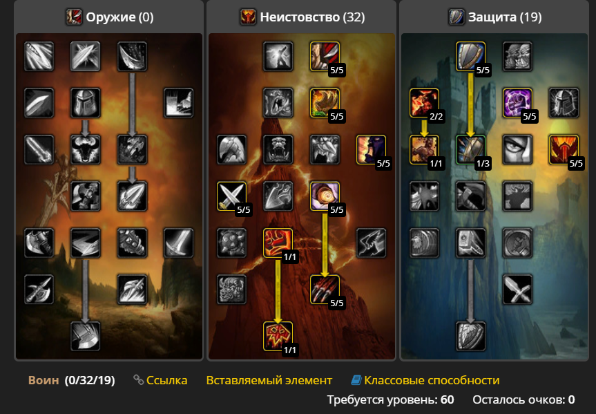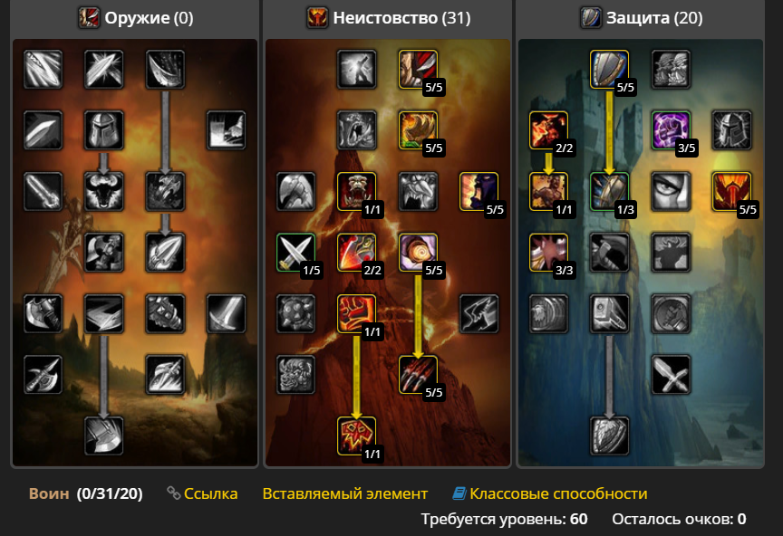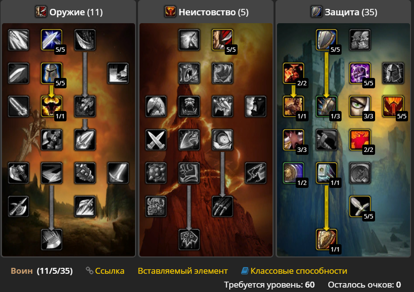 После получения 60-го уровня, вы будете использовать этот билд. Глубокое изучение ветки “Защита” позволяет получить доступ к таким мощным талантам, как Сокрушение щитом, Ни шагу назад, Неукротимость, Улучшенная провокация. Кроме того, у вас хватит очков, чтобы взять Тактическое превосходство и Управление злостью.