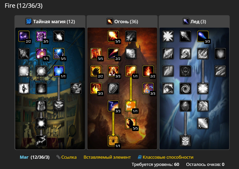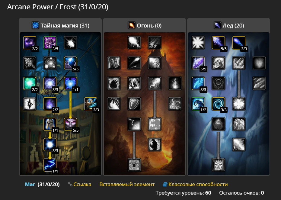 Самая мощная сборка в Классике для мага. Ценится из-за эффективного расхода маны (а маны в Ванилле не хватает всегда) за счет таких способностей, как Чародейская сосредоточенность, Чародейская медитация и Направленная сила льда, а также мощного бурст-дамага за счет кулдаунов, например, Мощь тайной магии. Присутствие разума также может принести огромную пользу в уничтожении приоритетной цели или АОЕ. Разыгрывая Огненный столб, затем Присутствие разума чтобы еще раз применить столб – отдельный вид прекрасного. Дамаг-метры подскочат до небес. Чтобы добить врагов, использйуте Ледяные осколки чтобы усилить ваши заклинания.