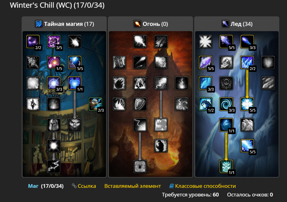 WC – лоу-ДПС сборка, однако приносит большую полезность рейду. Этот билд по прежнему использует такие способности, как Ледяные осколки и мана-реген скиллы, но упускает бурст-урон, который давала нам ветка Тайной магии. Талант, на котором прежде всего основан билд – имняя стужа. Особенности классического WoW позволяют сильно увеличить урон ВСЕГО рейда по цели. Также, в этом билде, мы имеем мощные защитные заклинания Ледяная глыба и Ледяная преграда
