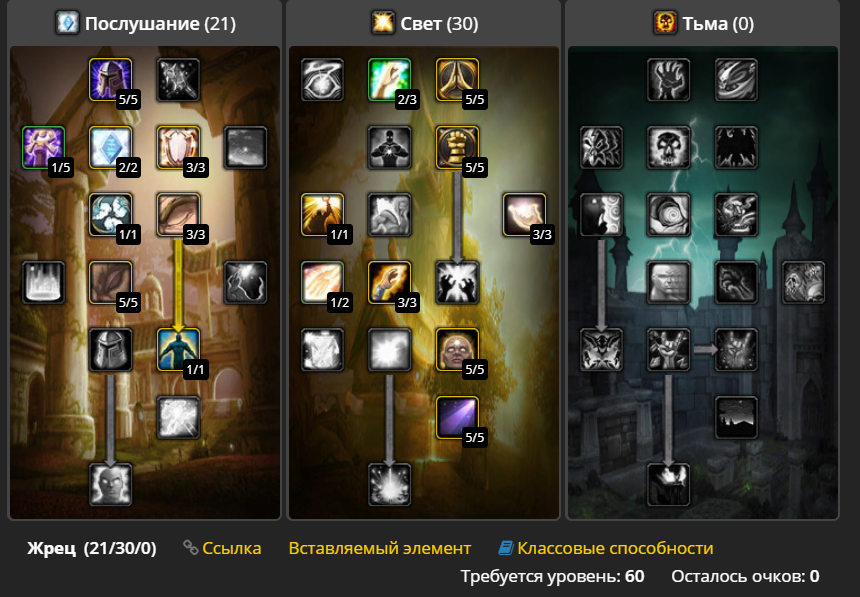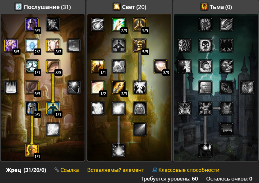 Это ДЦ билд, и он служит для того, чтобы жрец мог приносить больше пользы рейду, жертвуя своими лечащими заклинаниями. Цель билда – добраться до Придание сил, которое может быть очень мощным спеллом при использовании на союзника с ТОП-ДПС. Вы также получаете больше маны за счет Сила мысли.