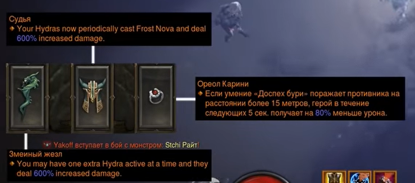 С помощью кольца получаем меньше урона во время Доспеха Бури. С помощью шлема даем гидрам способность атаковать холодом и примораживать противников. Жезл повысит урон и позволит призвать еще одну гидру.