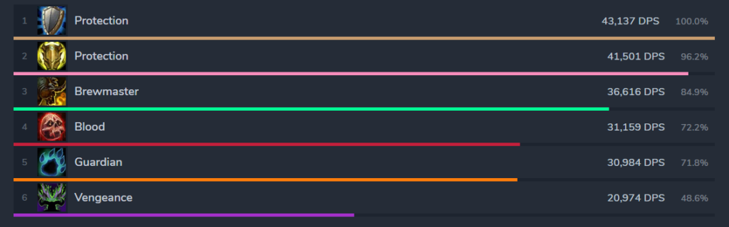 Рейтинг танков составлен с учетом боя с одной целью (преимущественно рейды) и 470 ilvl экипировки у персонажа. Учтите, что в эти данные не закладывается сложность игры определенным классом. На некоторых специализациях легче выдержать определенное кол-во урона, однако при идеальном исполнении ротации и различных условиях, результаты могут отличаться.