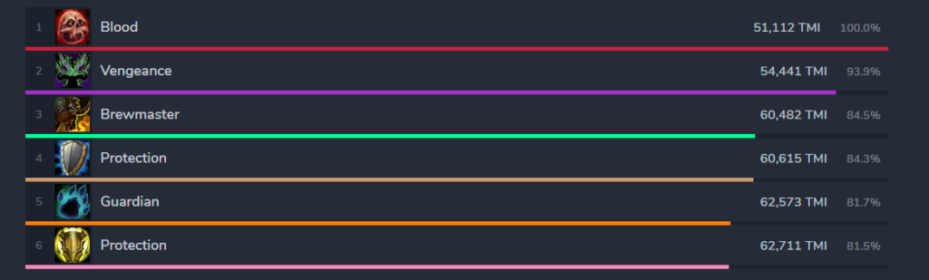 TMI – одна из оценок эффективности танкования. Определяет плавность и серьезность полученных повреждений. Чем значение TMI выше – тем более критический урон получает танк, ниже – соответственно, менее серьезные повреждения. Эквивалент 1000 TMI равняется, примерно, 1% здоровья игрока. То есть, 120К TMI показывает, что получен урон в размере 120% от общего кол-ва ХП персонажа.